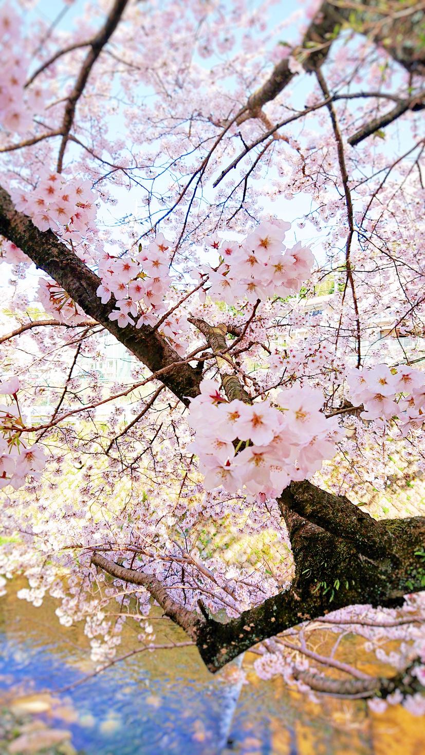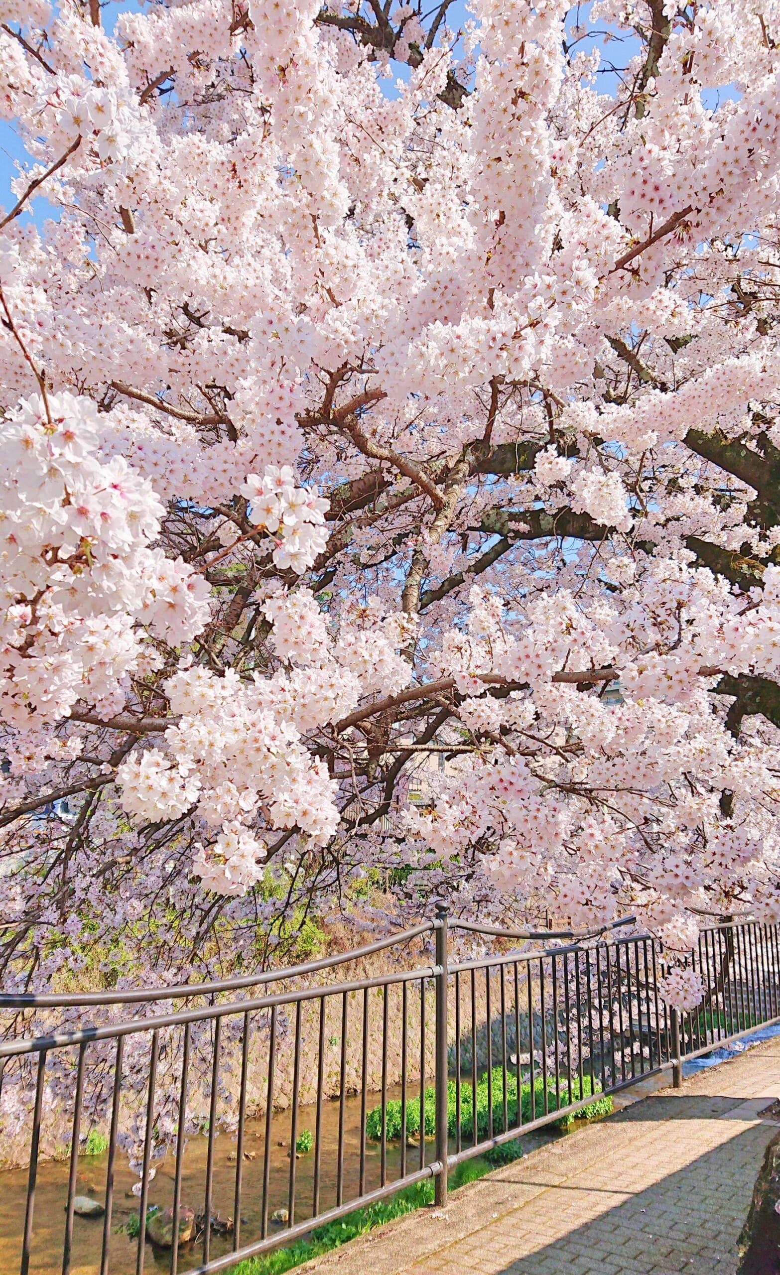 小さな橋の上から眺める川沿いの桜はため息が出るほど美しいです( *´艸`)