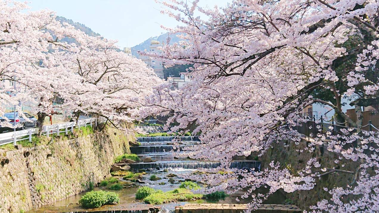写真の有馬川添いの桜並木は当館から徒歩2分です。